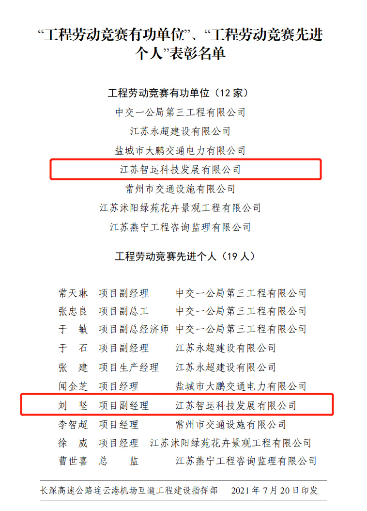 2021年7月20日,項(xiàng)目組收到了項(xiàng)目指揮部2021春節(jié)前夕開展的主題為“保質(zhì)量、保安全、保進(jìn)度、防疫情,大干 60 天”的勞動(dòng)競賽活動(dòng)表彰。江蘇智運(yùn)憑借專業(yè)項(xiàng)目實(shí)施和組織能力在競賽活動(dòng)中獲得了“工程勞動(dòng)競賽有功單位”稱號,項(xiàng)目副經(jīng)理劉堅(jiān)獲“工程勞動(dòng)競賽先進(jìn)個(gè)人”稱號。
