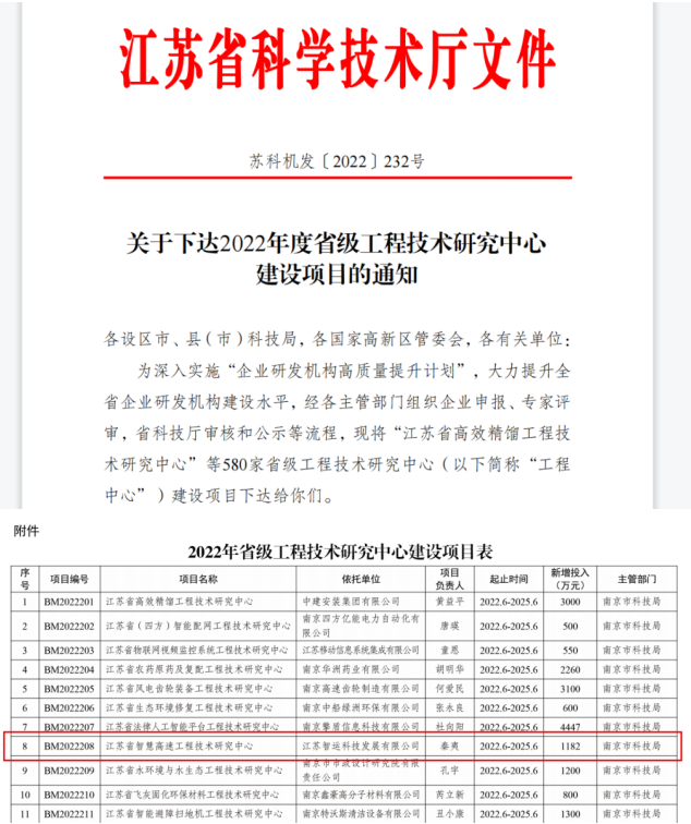 經(jīng)過(guò)前期南京市科技局組織申報(bào)、專家評(píng)審,省科技廳審核和公示等流程,2022年10月9日“江蘇省智慧高速工程技術(shù)研究中心” (以下簡(jiǎn)稱“工程中心”)正式獲得江蘇省科技廳批準(zhǔn)建設(shè)。該工程中心的獲批標(biāo)志著江蘇智運(yùn)科技發(fā)展有限公司(以下簡(jiǎn)稱“江蘇智運(yùn)”)的研發(fā)能力及研發(fā)水平已獲政府及行業(yè)廣泛認(rèn)可。