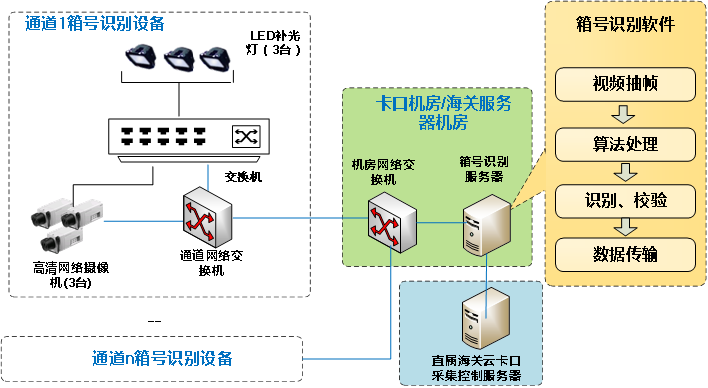 AI集裝箱箱號(hào)識(shí)別系統(tǒng)的硬件部分由攝像機(jī)設(shè)備、補(bǔ)光控制設(shè)備、GPU服務(wù)器、算法處理服務(wù)、箱號(hào)接口服務(wù)及網(wǎng)絡(luò)傳輸和計(jì)算機(jī)等輔助設(shè)備組成。系統(tǒng)軟件系統(tǒng)部分由視頻抽幀、算法處理、識(shí)別及校驗(yàn)、數(shù)據(jù)接口傳輸服務(wù)等組成。