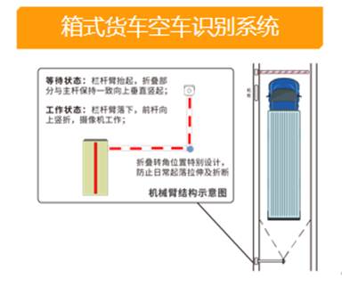 箱式貨車空車識別系統(tǒng)由攝像機(jī)、機(jī)械臂、控制器、算法分析服務(wù)、空車識別輔助決策系統(tǒng)組成。車輛駛?cè)肟谕ǖ劳7€(wěn)后,通過上位機(jī)自動或人工(駕駛員或現(xiàn)場管理人員)信號,觸發(fā)機(jī)械臂啟動伸出動作,伸出到位后、反饋到位信號給控制器并上報至上位機(jī);上位機(jī)程序自動完成控制攝像機(jī)采集、視頻抽取、識別等工作;待識別結(jié)束后,上位機(jī)自動或通過擋桿抬桿信號或人工信號,觸發(fā)機(jī)械臂收回動作,收回到位后、反饋到位信號給控制器并傳輸給空車識別輔助決策系統(tǒng),結(jié)束空箱檢測流程。