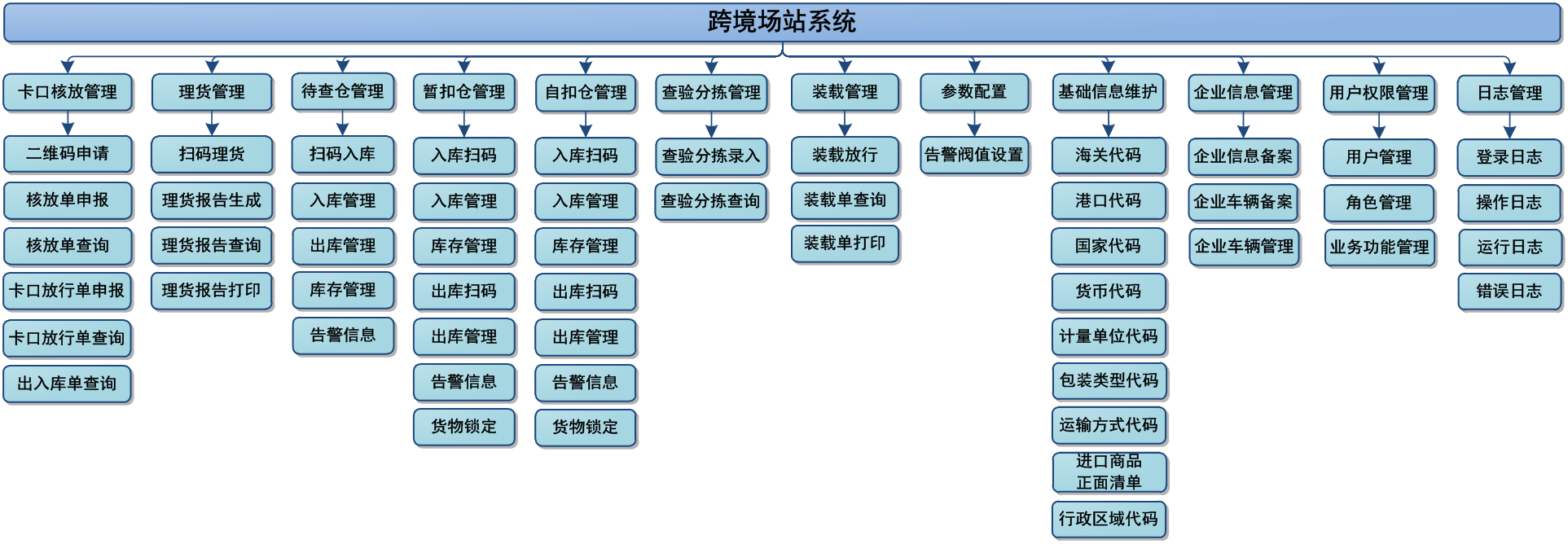 場站管理系統(tǒng)包含車輛備案管理、二維碼管理、核放單管理、卡口放行單管理、堆場管理、倉庫管理、查詢統(tǒng)計、基礎(chǔ)資料管理等功能模塊。